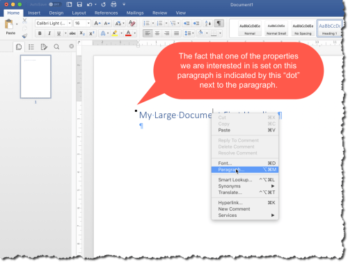 Also note that because the paragraph whose settings I’m examining, had its style set to Heading 1, one or more of the properties we’re interested in my document, have already been set, and this is indicated by the “dot” to the left hand side of the paragraph. This holds true for all of the Pagination properties we’re discussing in this article. Whenever one of these Pagination properties, other than Widow/Orphan control are set, then this dot will be visible to the left of the paragraph, indicating that at least one of the other three Pagination control settings are set on.
