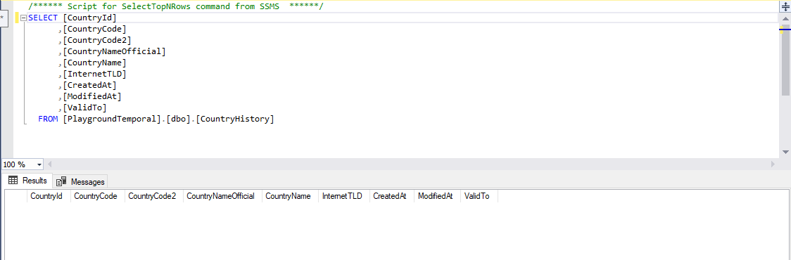 CREATE TABLE [dbo].[Country]( [CountryId] [int] IDENTITY(1,1) NOT NULL, [CountryCode] [char](3) NOT NULL, [CountryCode2] [char](2) NOT NULL, [CountryNameOfficial] [nvarchar](100) NOT NULL, [CountryName] [nvarchar](25) NULL, [InternetTLD] [char](3) NULL, [CreatedAt] [datetime2](7) NOT NULL, [ModifiedAt] [datetime2](7) GENERATED ALWAYS AS ROW START NOT NULL, [ValidTo] [datetime2](7) GENERATED ALWAYS AS ROW END NOT NULL, PRIMARY KEY CLUSTERED ( [CountryId] ASC ) WITH (PAD_INDEX = OFF, STATISTICS_NORECOMPUTE = OFF, IGNORE_DUP_KEY = OFF, ALLOW_ROW_LOCKS = ON, ALLOW_PAGE_LOCKS = ON) ON [PRIMARY], PERIOD FOR SYSTEM_TIME ([ModifiedAt], [ValidTo]) ) ON [PRIMARY] WITH ( SYSTEM_VERSIONING = ON ( HISTORY_TABLE = [dbo].[CountryHistory] ) ) GO ALTER TABLE [dbo].[Country] ADD DEFAULT (getutcdate()) FOR [CreatedAt] GO