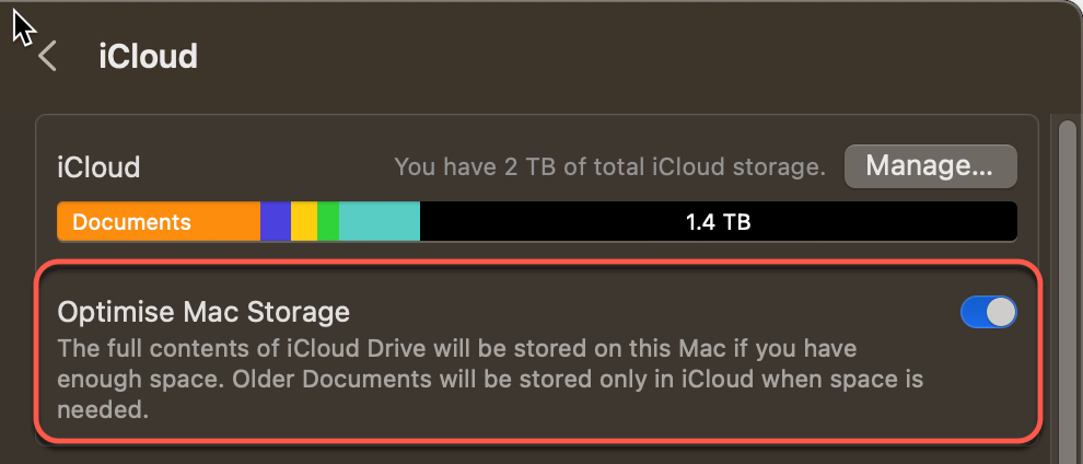 You can imagine my surprise when after running one of my weekly syncs, I found that quite a large number of files appeared to be missing from my local iCloud Drive repository? Where could they be? It was at this point, I did do some reading, and this was where I became more familiar with the Optimize Mac Storage setting. So I realised that it made some sense for this setting to remain On for both of my laptops – so that their more limited storage didn’t try to keep the entirety of my iCloud Drive repository on their relatively small boot drives.