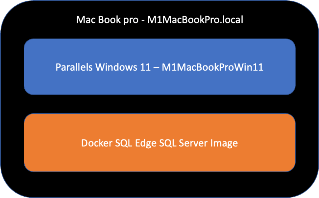 - The following diagram shows how the Mac OS host machine, the Parallels Windows 11 virtual and the locally running Docker SQL Server Edge image are related: