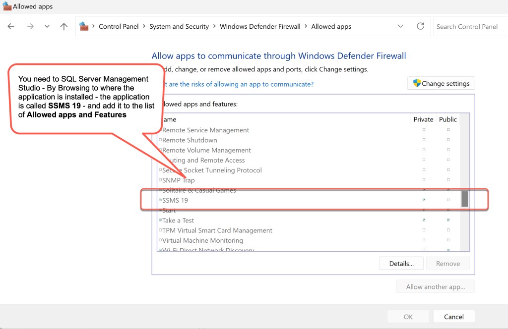 - Firewall Configuration: We need to add the SQL Server Management Studio application to the list of “allowed applications” in the Windows Firewall exemption list, as highlighted in the screen shot below, of the Windows 11 Virtual Machine.