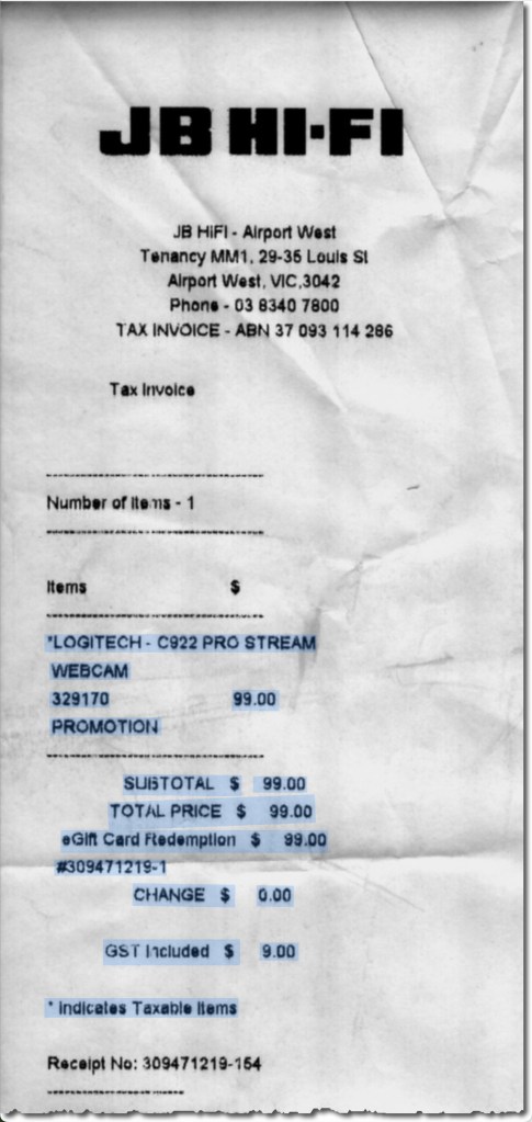 And it has some really neat features, particularly relating to images. The one I want to highlight is a way to extract text from scans of textual content – essentially retrospective OCR. Let’s look at an example. Here’s a receipt for a new Webcam I purchased recently.