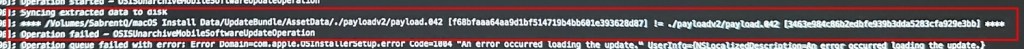 So it seemed highly likely that this was the root cause of my problems. My machine was calculating a different checksum than what the Installation package was saying it should be? And hence the Installers were being reported as corrupted. Below – and excuse the quality of the image – it’s a photo of the installation log on the iMac – is an example of the problem.